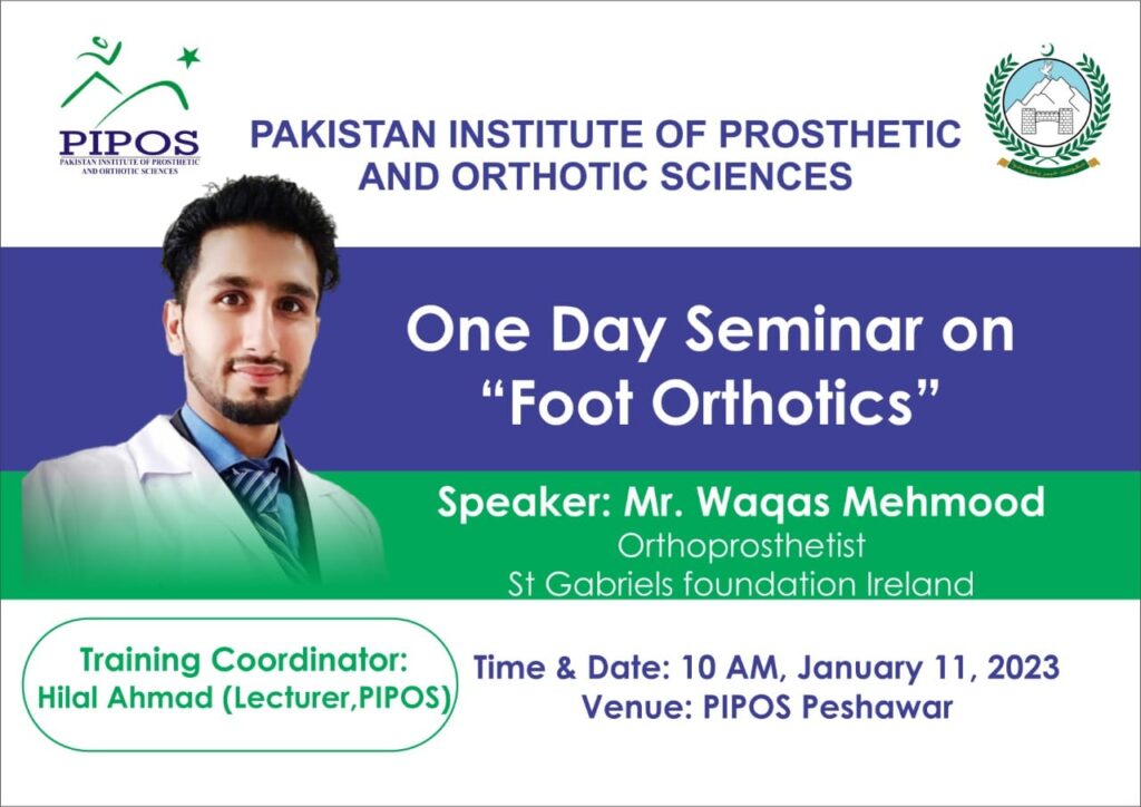 Pakistan Institute of Prosthetic and Orthotic Sciences (PIPOS) is organizing a one day seminar on Foot Orthotics at PIPOS Peshawar on 11 January 2023 at 10 AM. For more details please contact at